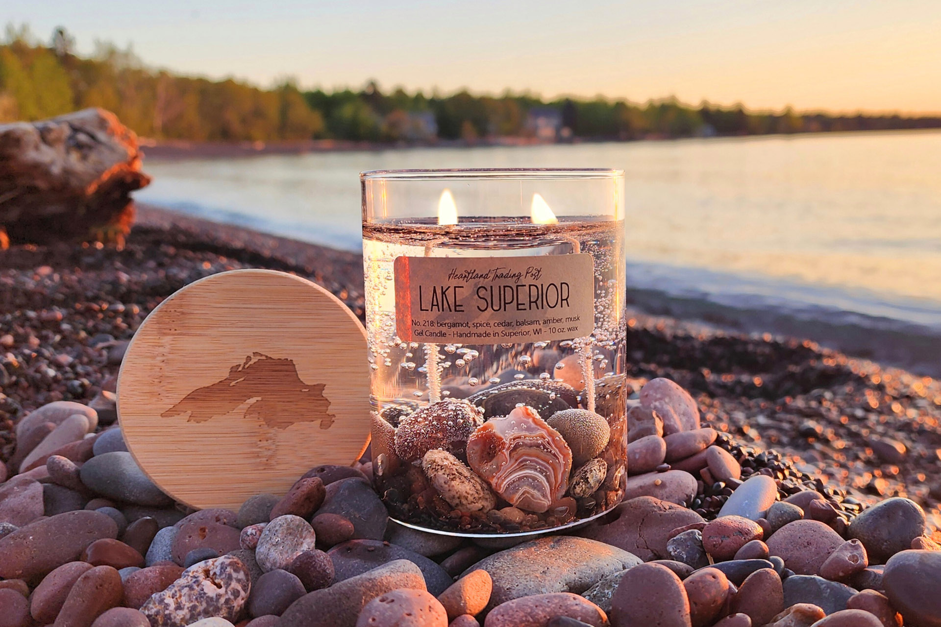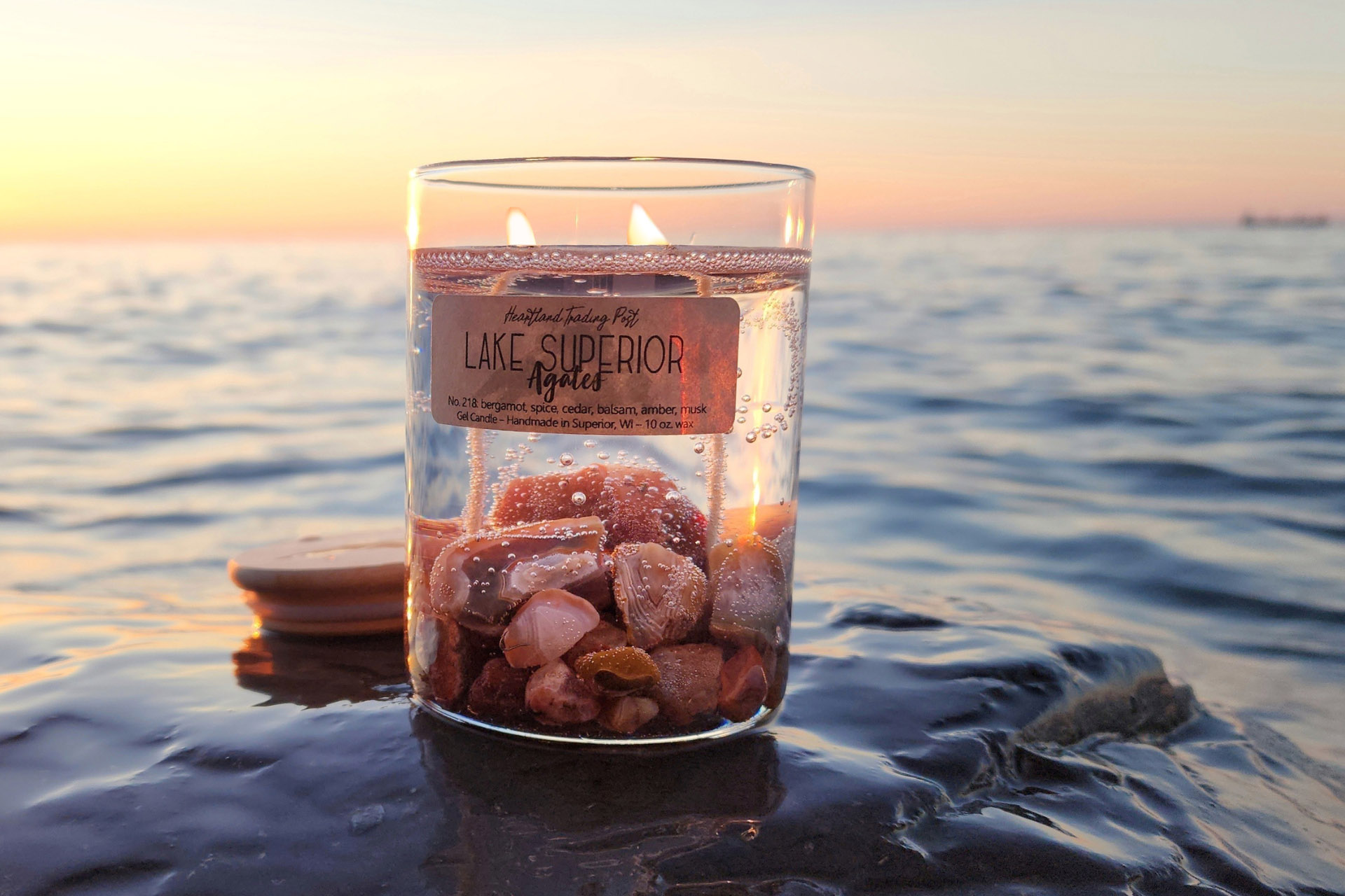 The "Original" Lake Superior candles contain a variety of handpicked, authentic Lake Superior beach stones and feature one raw, natural Lake Superior Agate displayed in the front!