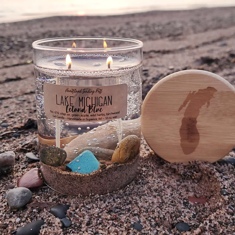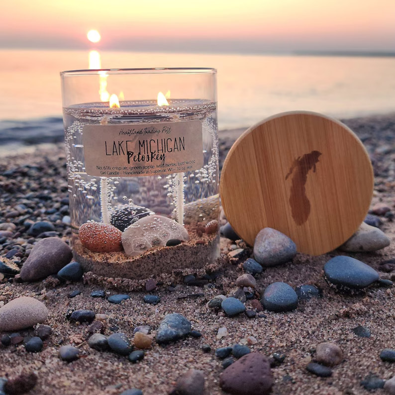 This candle features a base of lake sand and a variety of handpicked beach stones from the shores of Lake Michigan! Also featured in this candle is an authentic, natural Petoskey Stone!